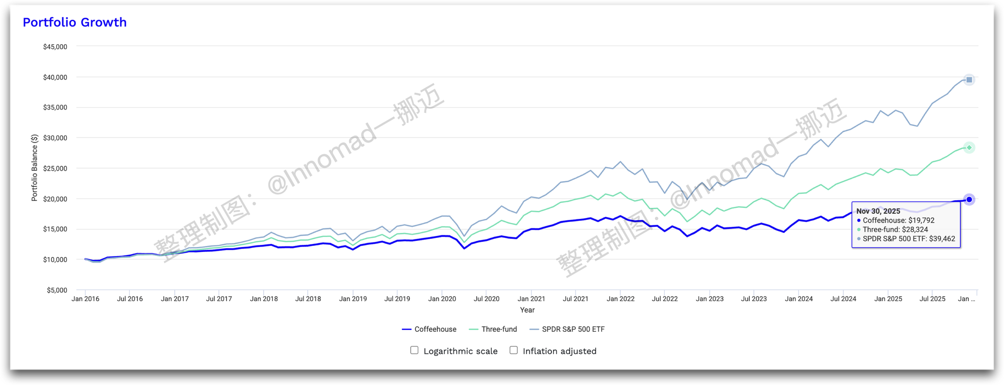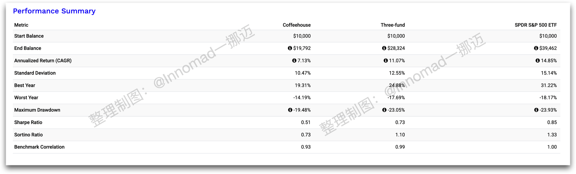 从增长曲线看,随着风险分摊得越多,增长越是少。Coffeehouse 既然是懒人组合,增长自然不是其两点。