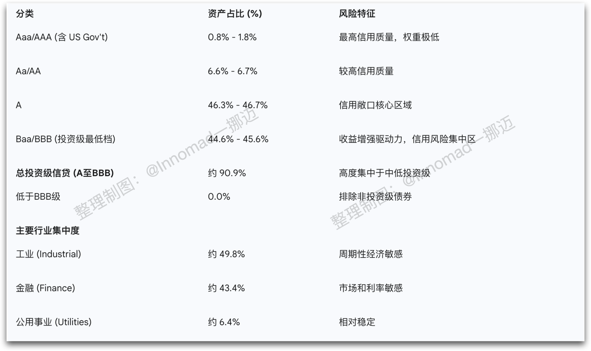 主要投资标的 (Primary Holdings): 投资级公司债券(约90%集中在A级和Baa/BBB级)