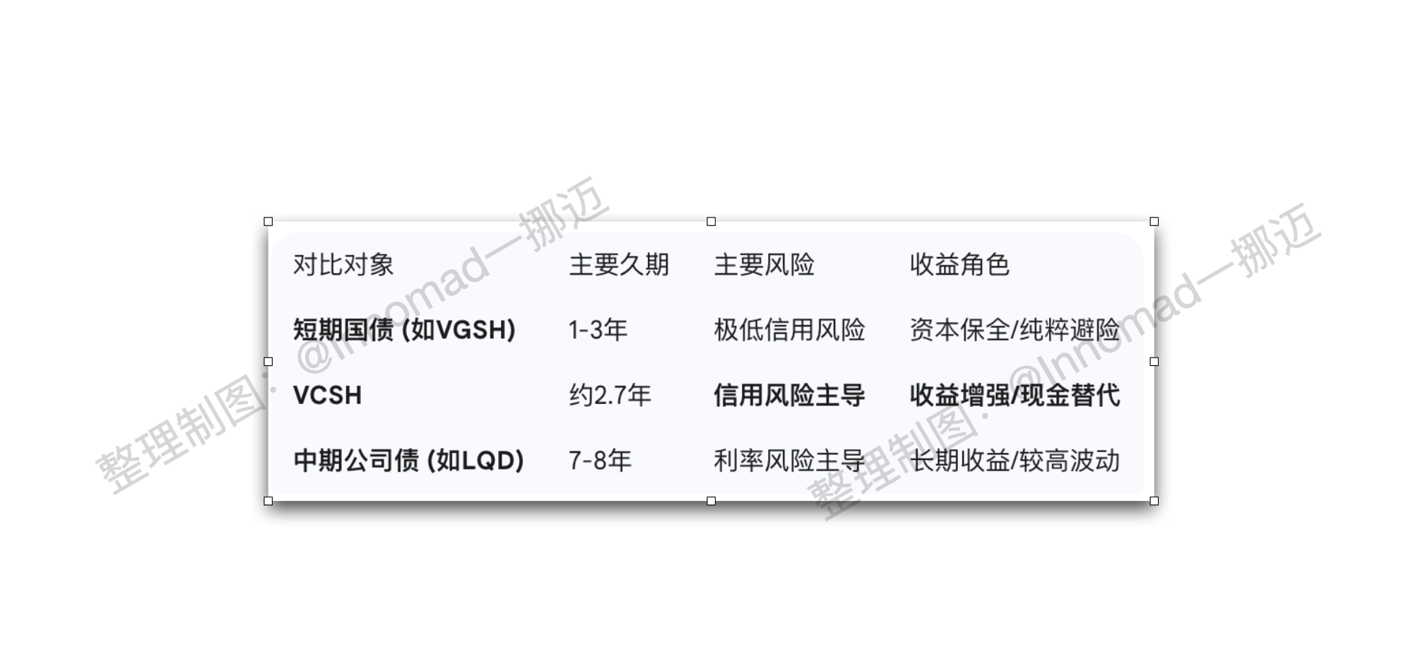 如:在2020年3月因疫情导致的信贷恐慌中,正是信用利差的突然大幅扩大,导致VCSH遭受了显著的资本损失。这证实了VCSH的风险特征:它有效对冲了利率风险,但却高度暴露于信贷风险。