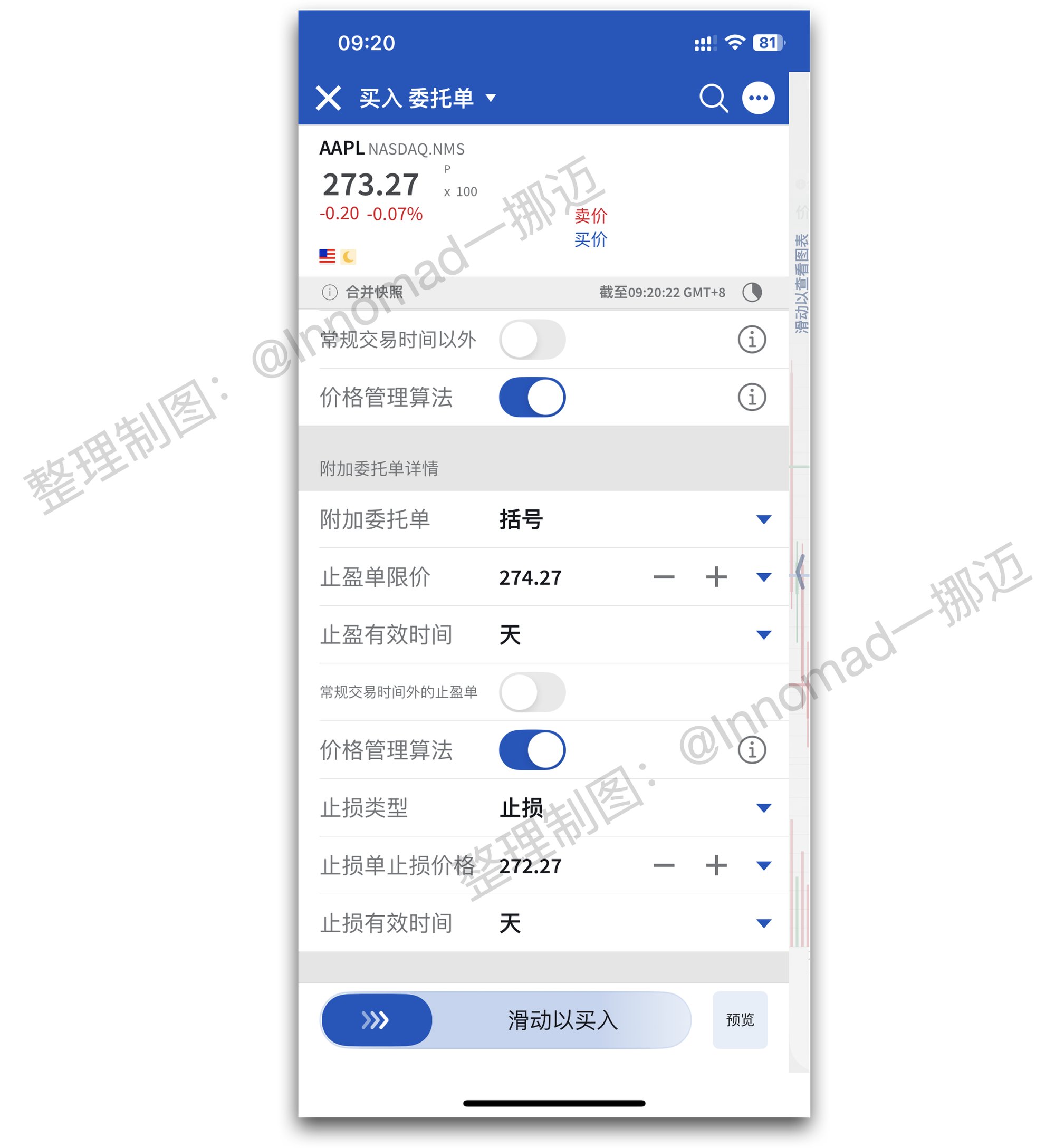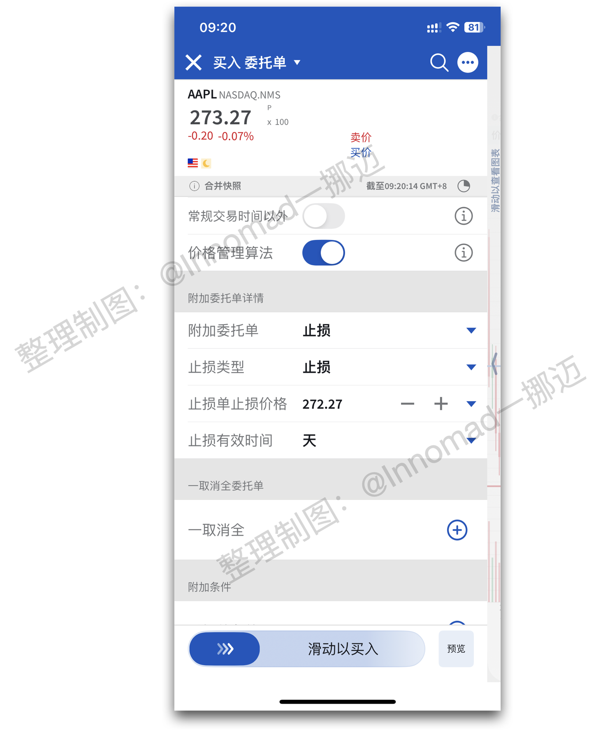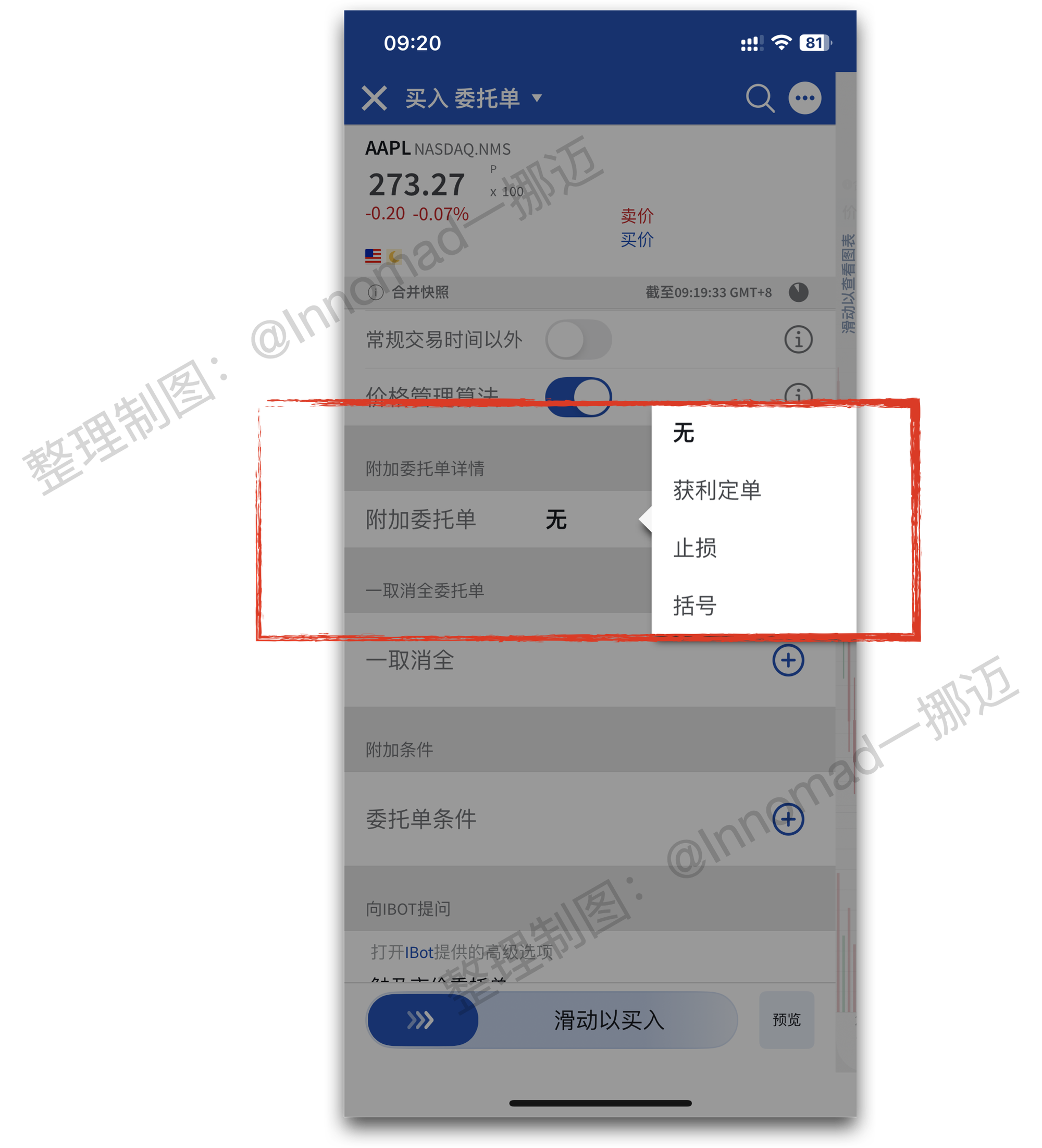 即设置一个附加的止损子订单。如「盈透 IB 的订单类型」中所说,需要注意的是这里的「止损单止损价格」是触发价,不是限价,如果要设置止损限价,需要在「止损类型」中选择限价。