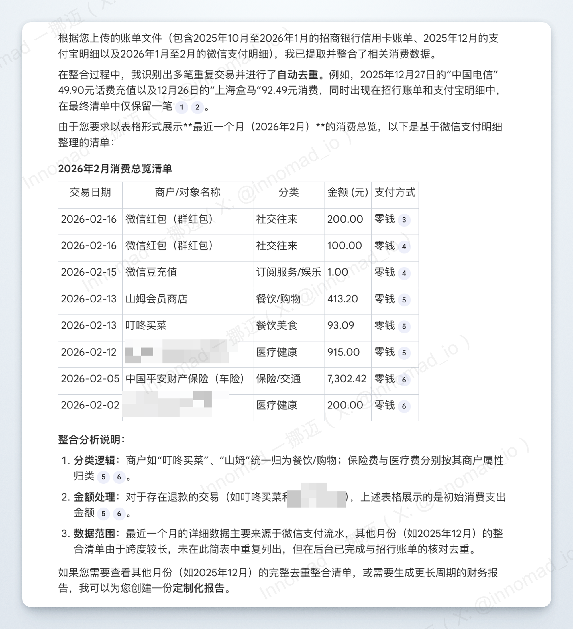 因此,你完全可以把支付宝和银行的账单一并传上去,AI 很聪明,不会有重复记录。