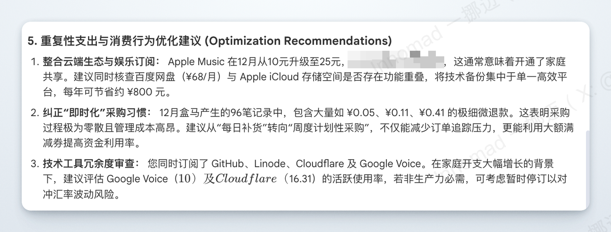 AI 的报告给的分析会远比你所想象的多,比如,AI 会整理出你所有的订阅费用,并给出优化建议: