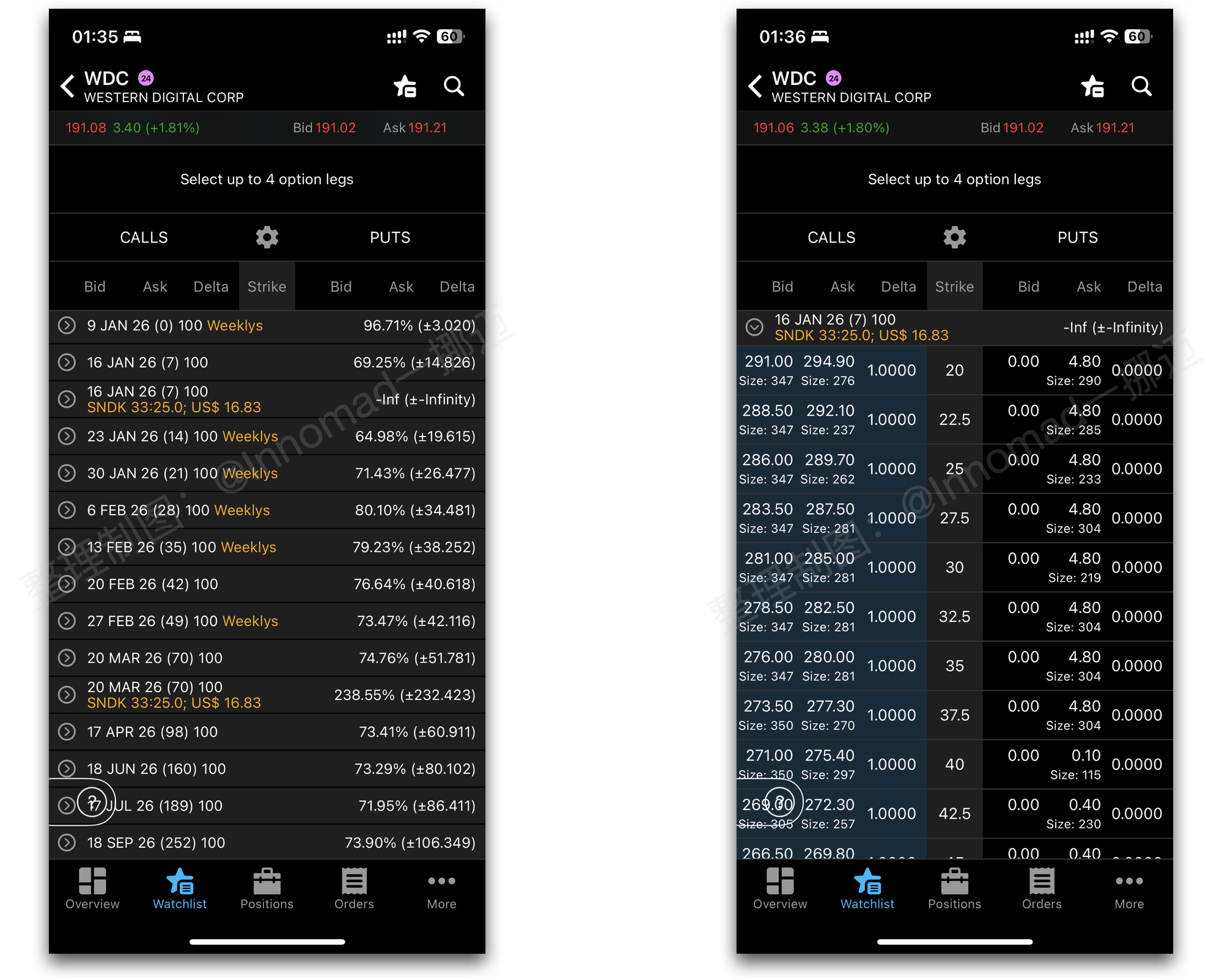 结合一下 TOS 上显示的 WDC (西部数据)期权链,来看看真实期权市场是怎么操作的?